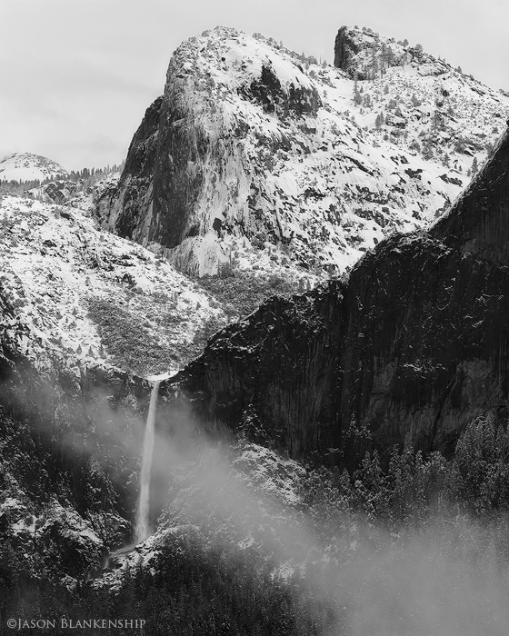 Spectacular view of Yosemite Valley's Bridalveil Falls after a winter storm.